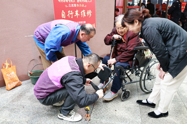 修理自行车区域的志愿者认真检查故障,凭借专业的技能,迅速解决了居民们自行车和出行轮椅上出现的各种小问题。调整刹车、拧紧螺丝、更换小配件等,他们都做得游刃有余,让居民们的出行工具重新焕发生机。
