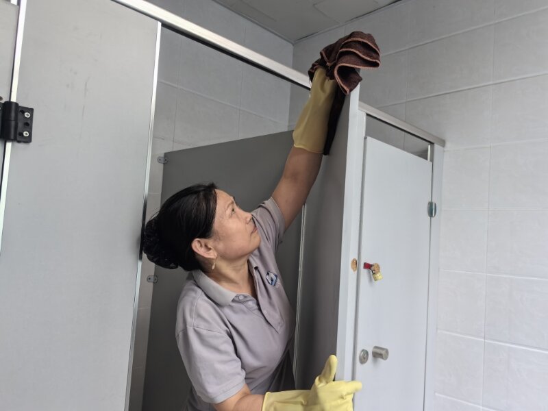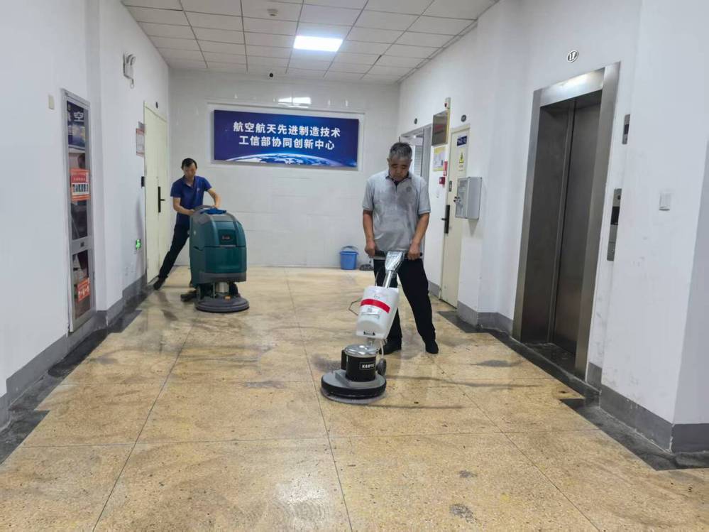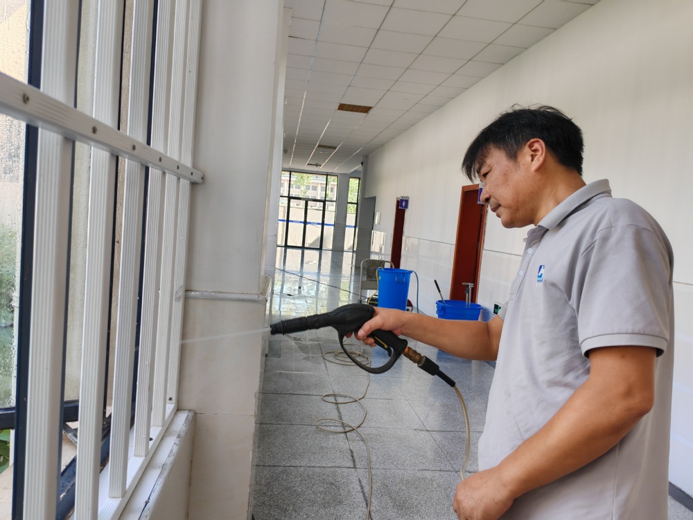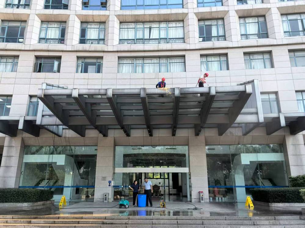 开学前,物业服务部对各楼宇公共区域全面开展深度清洁,一方面,针对大厅、走廊、楼梯、电梯等人员密集场所进行重点清扫与消毒;另一方面,重点聚焦容易被忽视的卫生死角,组织员工对卫生间角落、楼梯扶手缝隙、纱窗灰尘以及墙面污渍等细节区域进行彻底清洁,进一步提升楼宇整体环境。同时,组织专业人员对玻璃顶、雨棚等高空区域进行集中冲洗和擦拭。