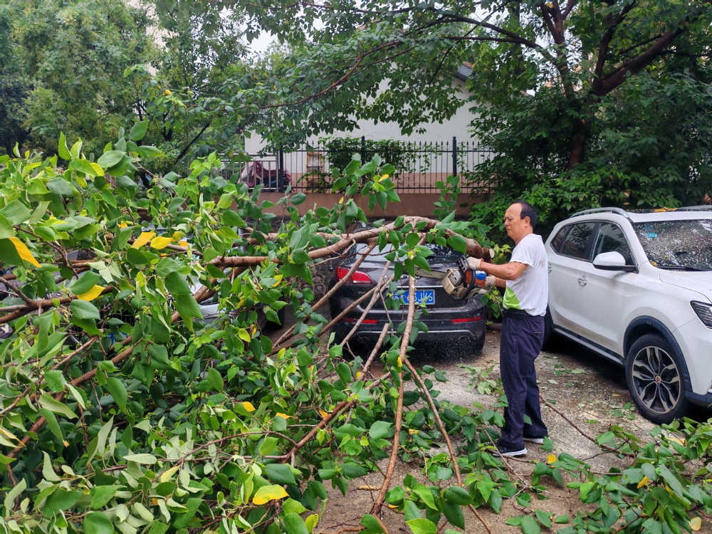项目部经理第一时间赶赴现场,迅速启动应急预案,有条不紊地组织员工开展清理工作。部门员工迅速响应,分工明确、密切协作,有员工负责用锯子进行切割,有员工负责搬运至指定地点,保证现场道路畅通,避免二次危险发生。在部门齐心协力之下,倒伏大树仅用一小时就被彻底清理干净,成功保障了业主的财产安全。