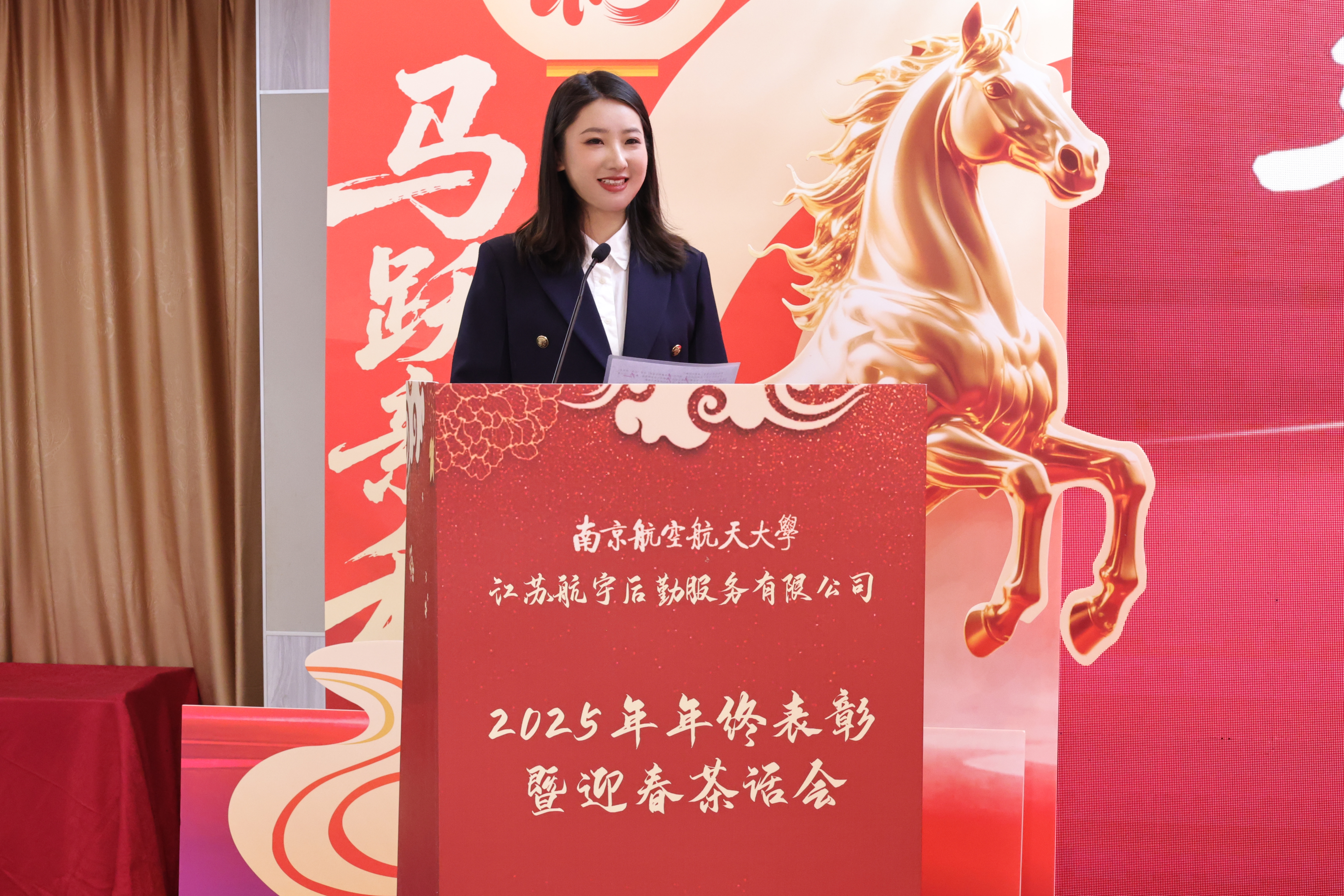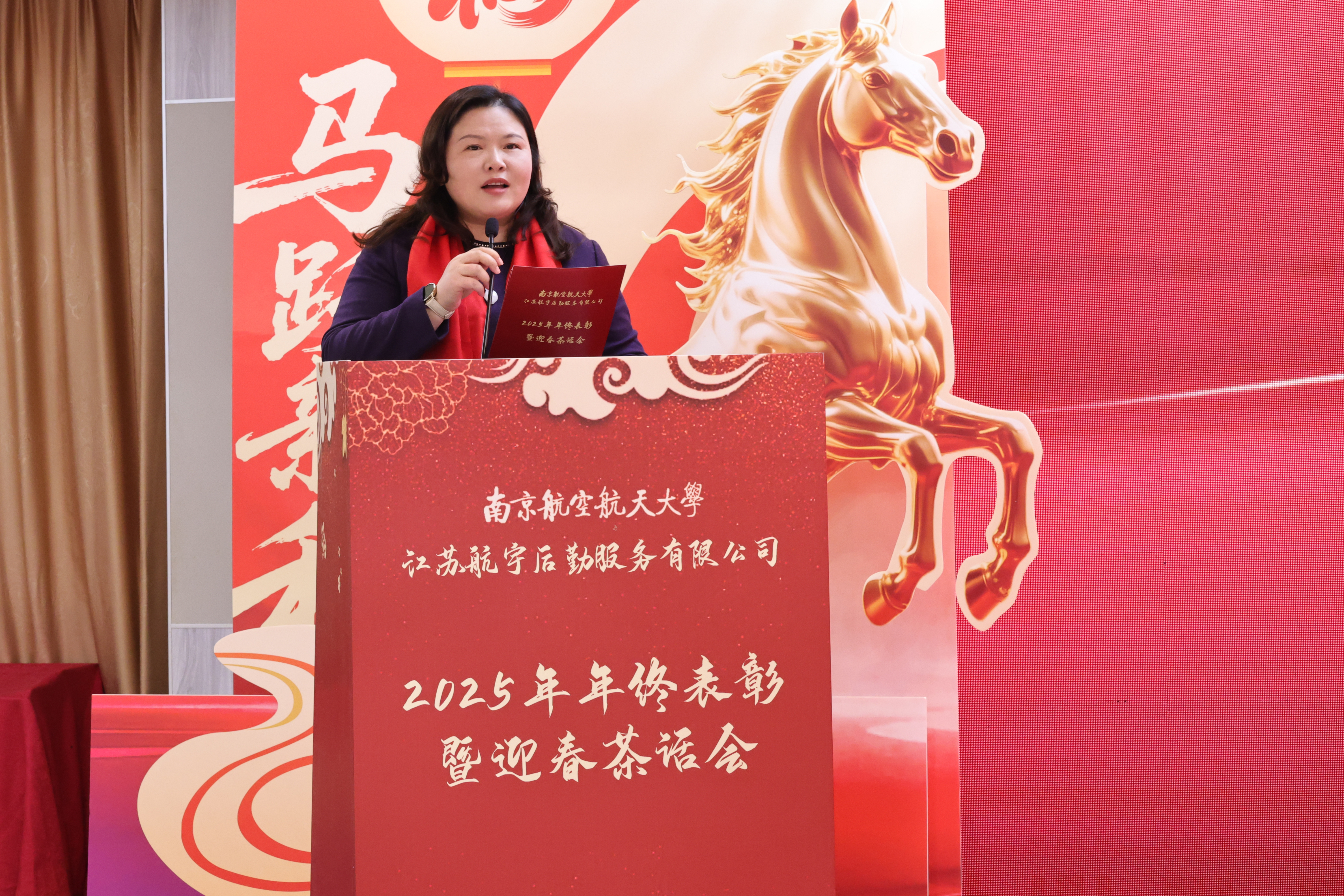 随后,航宇公司总经理涂志宏作总结发言。她向关心支持公司发展的学校各单位、全体员工及家属致以诚挚感谢与新春祝福,并全面回顾了2025年公司在服务保障、市场拓展、内部治理等方面的奋斗历程。展望2026年,她提出,要持续完善公司治理体系,提升服务满意度;积极拓展市场版图,实现营收稳步增长;坚决筑牢安全防线,推进重点工程完工。她勉励全体同仁要以“骏马奔腾”之势深化服务创新,以“马不停蹄”之姿强化管理升级,以“伯乐识马”之心加强队伍建设,凝心聚力,再创辉煌。