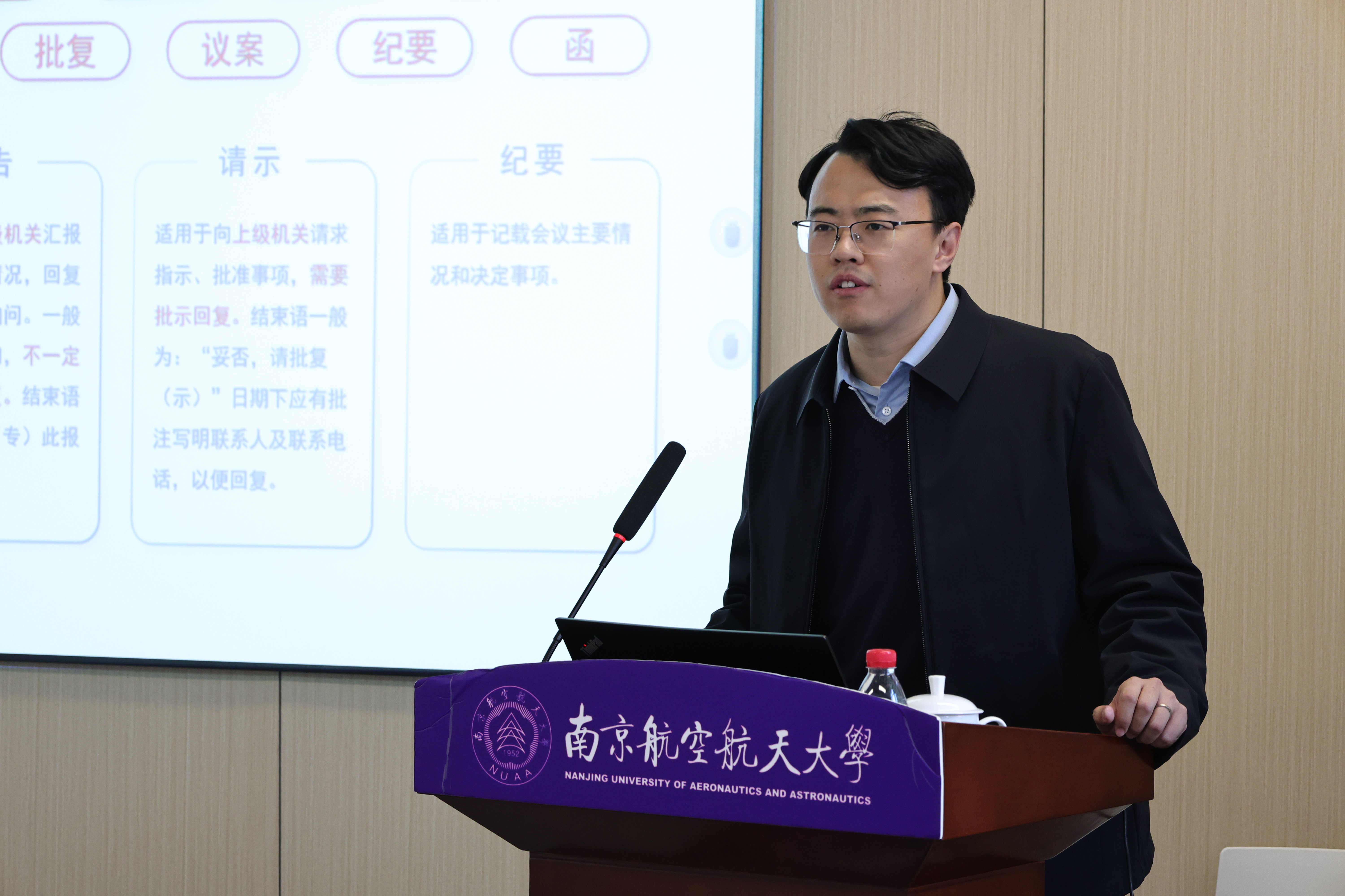 本次培训主讲人康冲,深耕公文写作与行政办公领域多年,兼具扎实的理论功底和丰富的实践经验,曾荣获江苏省第三届本科高校青年教师教学竞赛一等奖、江苏省最美辅导员、江苏省五一创新能手等多项荣誉。培训中,他以“为什么写公文、公文写给谁看、怎么写好公文”三个维度为切入点,系统讲解了公文格式规范、写作技巧等关键要点。他结合各类工作实例,重点剖析公文写作中常见的格式错误、用词不规范等问题,同时针对性推荐了实用学习书籍与快速提升方法,特别分享了AI技术在公文写作中的应用技巧。他提出,能写是真本领,愿写是好态度,写好公文如同做好每一项工作,要做到准确、规范,就要做到多积累、多学习、多思考、多用工具、多动手。参训人员全程认真聆听记录、积极互动交流,现场学习氛围浓厚。